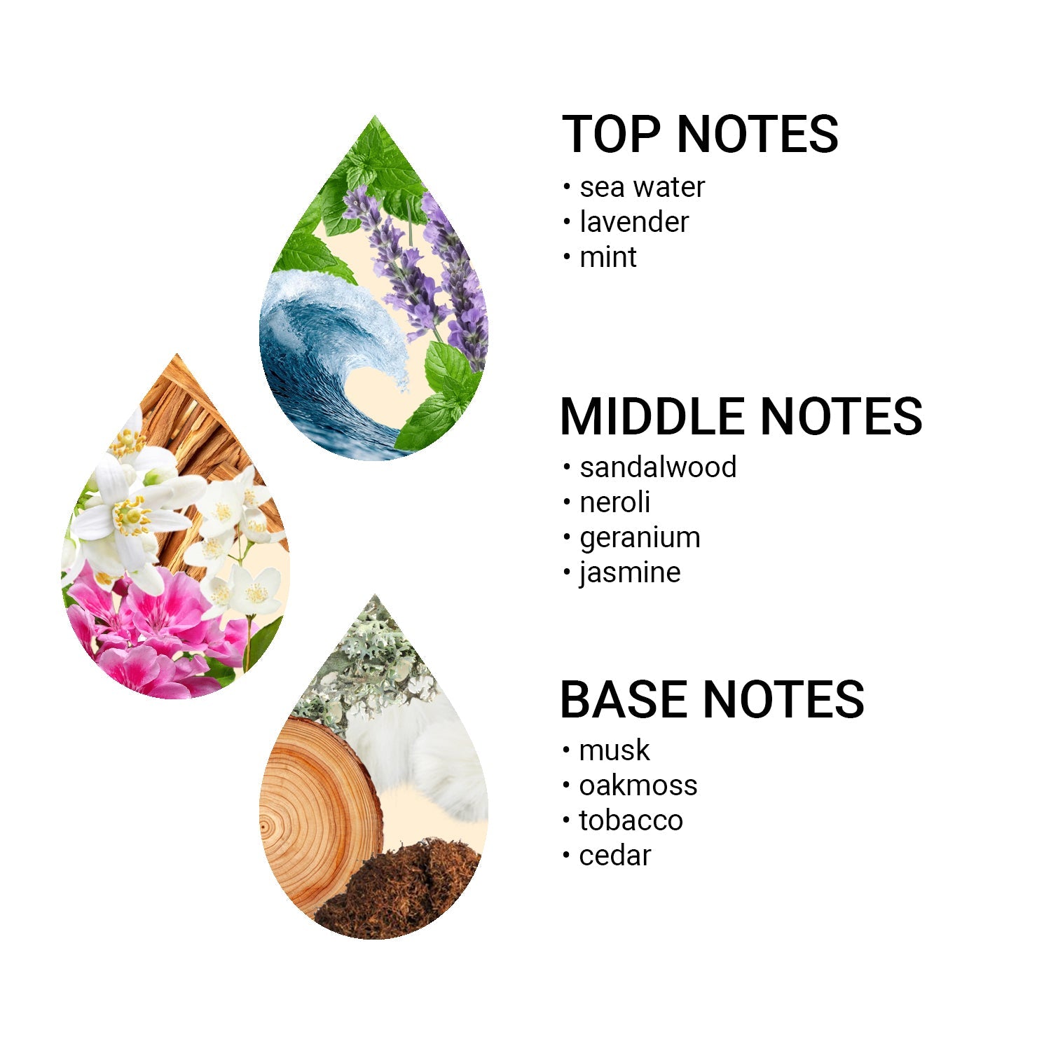 Vůně je svěží a ostrá, jednoduchá a velmi mužná. Svrchní tóny obsahují mátu a zelené tóny, levanduli, koriandr a rozmarýn. Srdce obsahuje pelargonii, neroli, jasmín a santalové dřevo. Mořské a ozonové tóny dodávají vůni pocit čistoty a svěžesti. Jedná se o tóny, které evokují vůni oceánu nebo svěžího vzduchu po dešti. Díky těmto tónům je vůně velmi osvěžující. Základ tvoří cedrové dřevo, pižmo, ambra a tabák. Je to vůně pro ty, kteří dávají přednost jednoduchosti a chtějí mít v místnosti vůni, která je osvěží a povzbudí. Je to vůně, která svou jednoduchostí a svěžími tóny zdůrazňuje mužnost a energii.