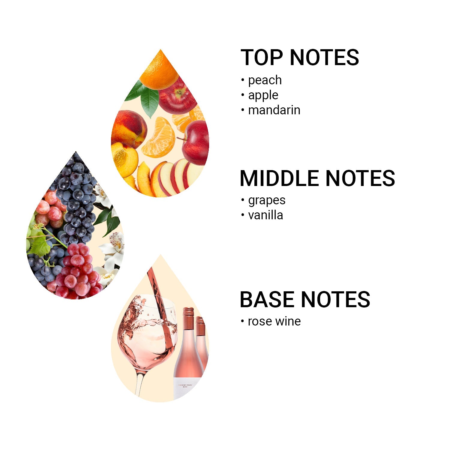Hroznové víno je základní složkou této vůně a přináší s sebou intenzivní ovocné tóny. Jeho vůně je sladká, šťavnatá a bohatá s živým ovocným aroma. Tóny vína dodávají vůni hloubku a zralost. Víno vnáší do vůně pocit elegance a komplexnosti. Ovocné tóny podtrhují sladký a svěží charakter vůně.
