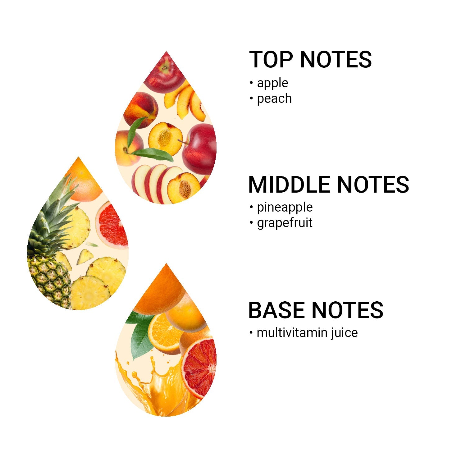 Vůně je složena z kombinace ovocných tónů, které společně vytvářejí sladký, svěží a osvěžující dojem. Tato vůně má schopnost navodit pocit letního ovocného koktejlu, plného svěžích a sladkých vůní. První výraznou nótou je sladký, šťavnatý ananas. Jeho příjemná kyselost a tropická sladkost přispívají k počátečnímu dojmu z vůně. Vůně broskve dodává vůni jemnost a bohatost. Citrusové tóny, jako je pomeranč a grapefruit, dodávají vůni živý a svěží rozměr.