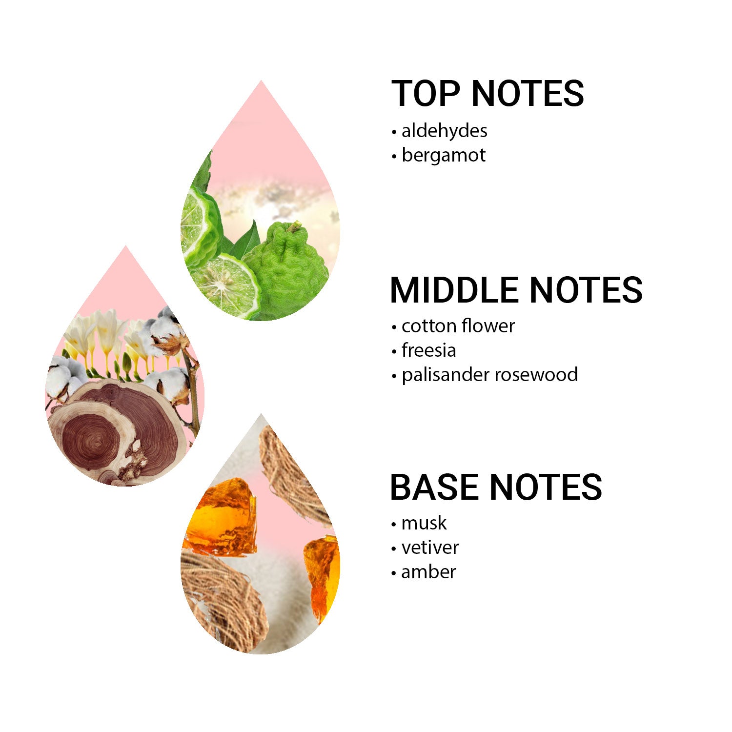Střední tóny zahrnují jemný bavlník a frézii, které poskytují svěží květinovou vůni, obohacenou o dřevitý nádech palisandru.