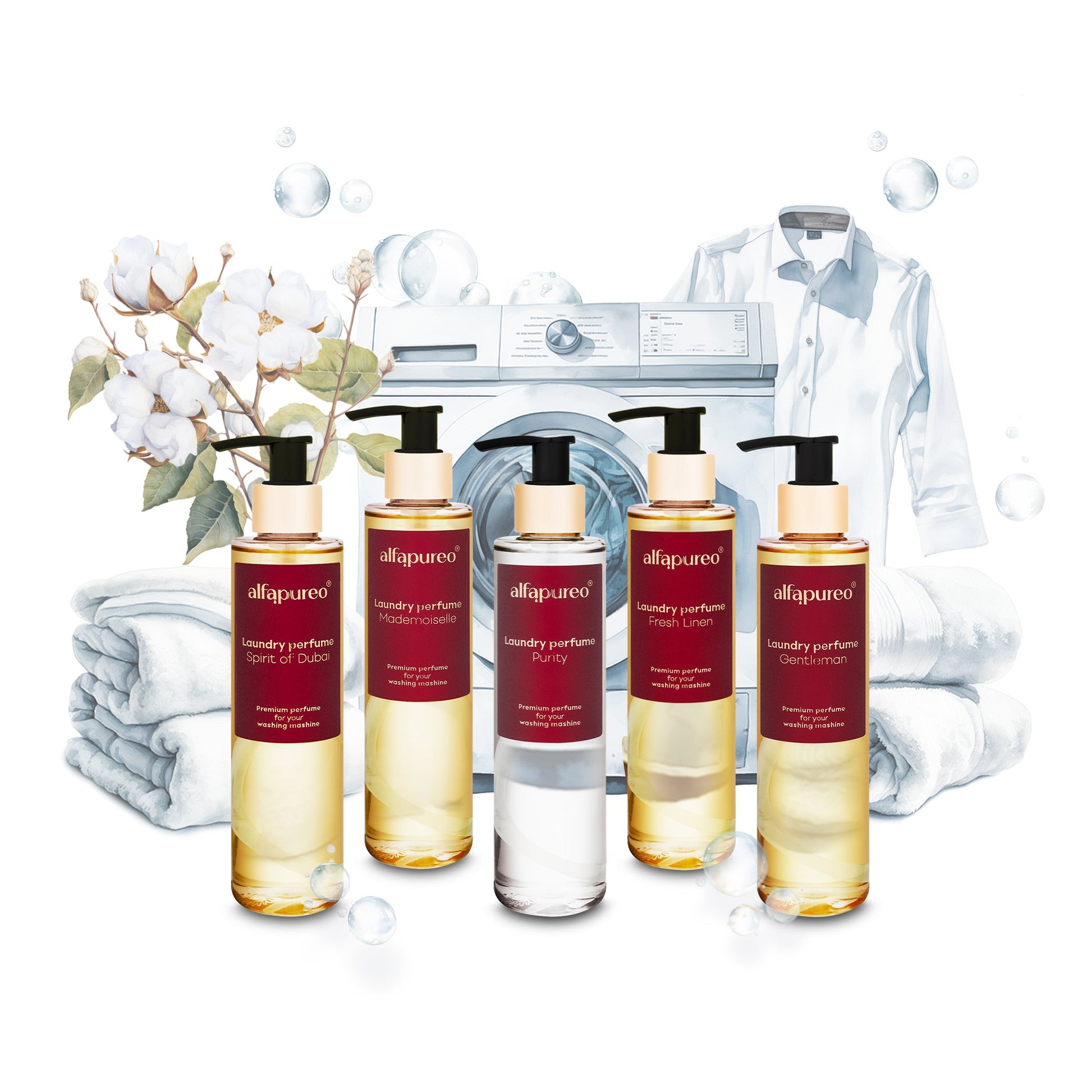 Přidejte svému prádlu nádech luxusu s našimi 100% koncentrovanými parfémy na praní AlfaPureo. Všechny vůně jsou inspirovány světoznámými parfémy a jsou vyrobeny z "jemných vonných látek", vonných kompozic, které se používají při výrobě tělových parfémů. Proto jsou šetrné k pokožce a jejich vůně se aktivuje až při nošení spodního prádla.