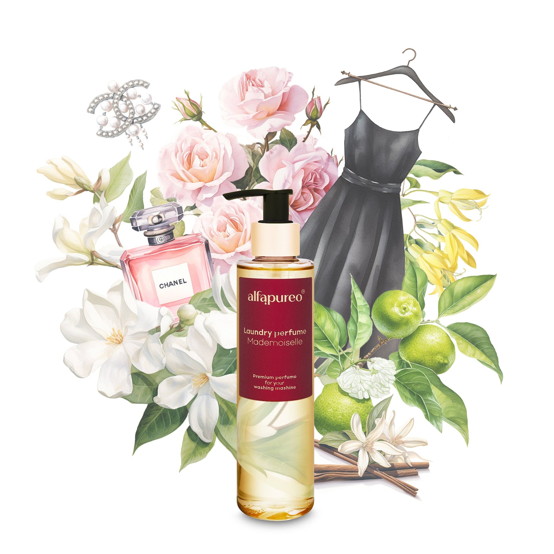 Mademoiselle - dámský parfém - inspirovaný luxusní květinovou vůní ikonické francouzské značky Chanel. Svěží a smyslná zároveň. Aromatický pomeranč, mandarinka a bergamot tvoří vrchol vůně, poté dostávají prostor jasmín, růže a ylang-ylang a v závěru prostoupí vaše prádlo pačuli, vanilka a bílé pižmo.