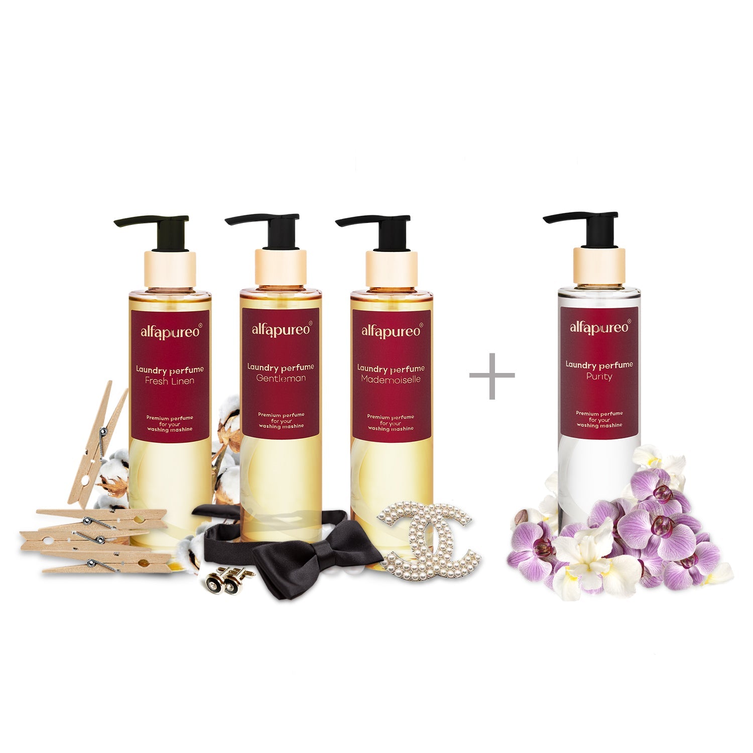 Přidejte svému prádlu nádech luxusu s našimi 100% koncentrovanými parfémy na praní AlfaPureo. Všechny vůně jsou inspirovány světoznámými parfémy a jsou vyrobeny z "jemných vonných látek", vonných kompozic, které se používají při výrobě tělových parfémů. Proto jsou šetrné k pokožce a jejich vůně se aktivuje až při nošení spodního prádla.