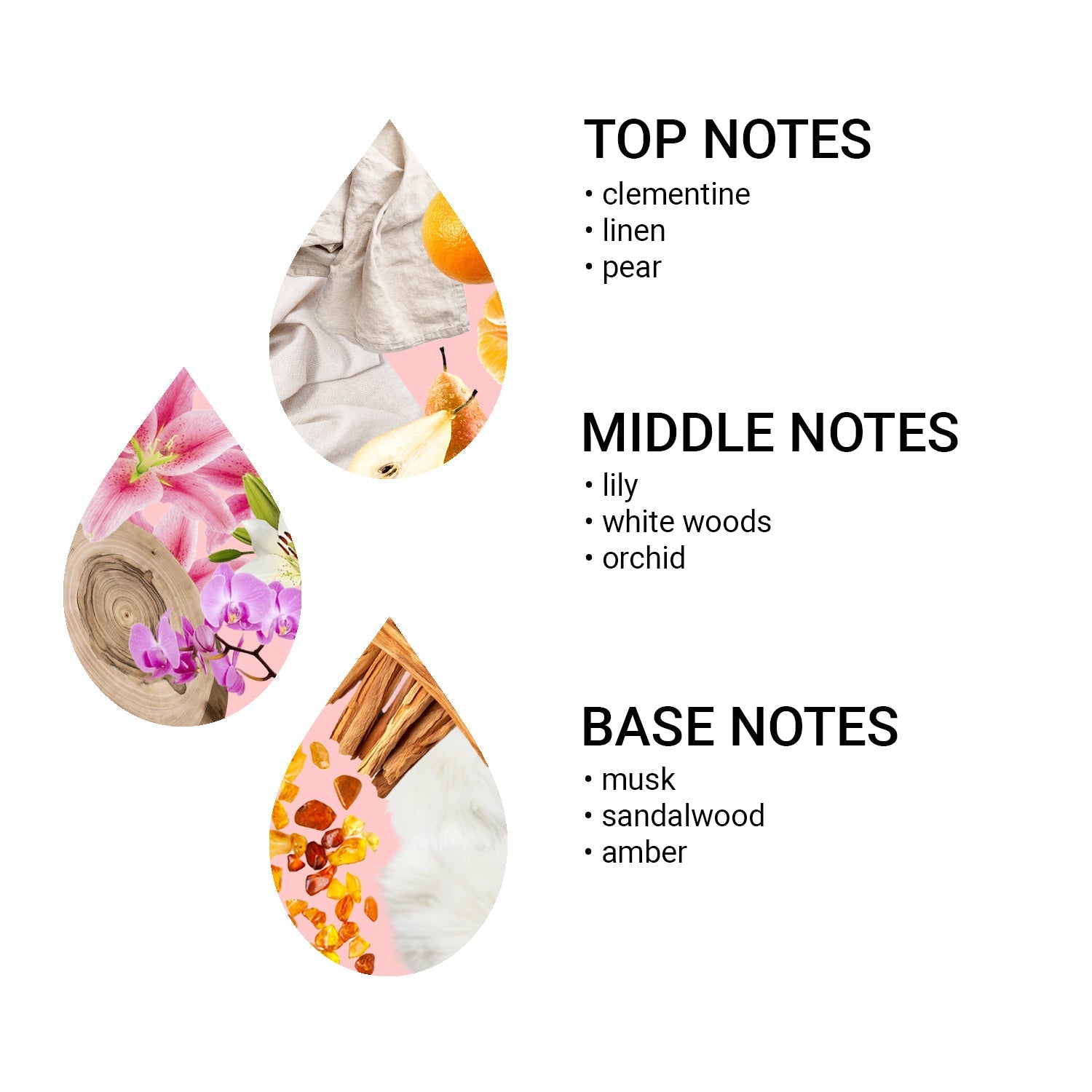 Purity - unisex parfém - představuje tradiční vůni čistoty a čerstvě vypraného prádla. Lotosový květ a lilie tvoří vrchol vůně, zatímco intenzivní základ z bílého dřeva a pačuli přetrvává na prádle.